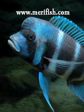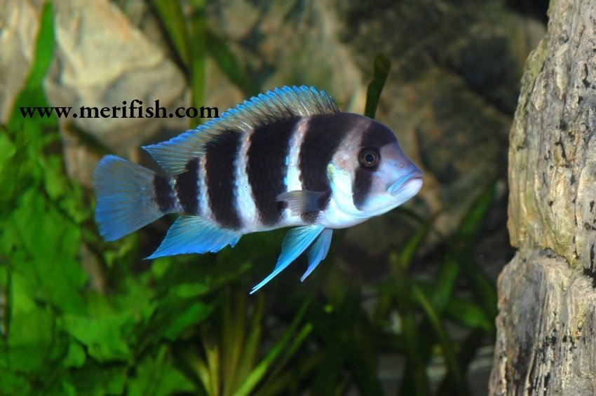 Frontosa Cichlids generally have a white or light blue body with either 6 or 7 black vertical bars along each side. As adults, they develop a large cephalic hump on the front of their head which is typically more pronounced on the male than the female. This hump is actually a large fat deposit that rests atop a dorsal muscle that tends to extend forward. The hump develops and increases in size with age and is usually a sign of sexual fecundity. Their fins also become more elaborate with age, which makes a mature Frontosa a very impressive sight as the combination of their large size, attractive coloration and elaborate fins make them a truly impressive sight to behold.